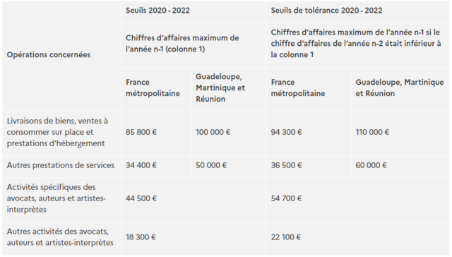 Selon ton secteur d’activité, les produits ou prestations que tu proposes, le taux de TVA peut varier et les plafonds également.